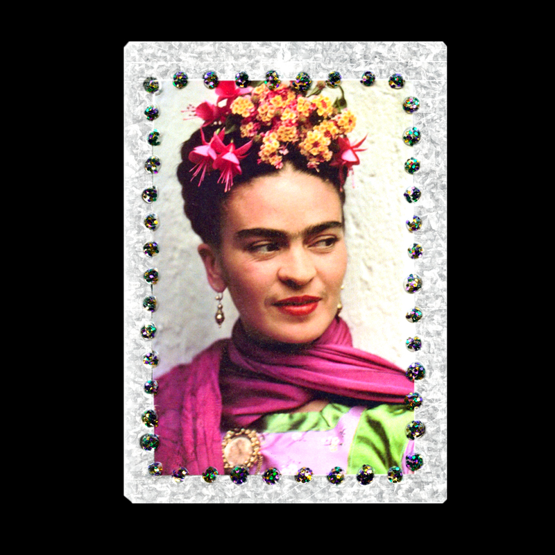 Photograph of Frida Kahlo adhered to a metal plaque and embellished with glitter. Â You can use as an ornament (ribbon included), a wall plaque (hole at top ready for hanging) or a magnet (magnet on back)! Handmade in the USA.