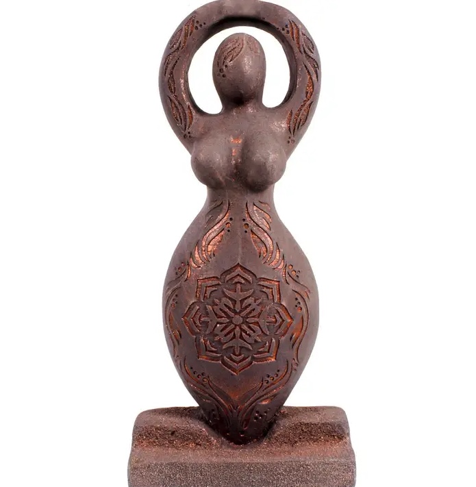 Lotus Goddess Sculpture. She is adorned in a sparkling copper wash with the lotus image etched into her center. Look closely and you’ll see the lotus design incorporates flying bird images. Her natural dark brown finish highlights her carved details. Made in Canada of natural gypsum.