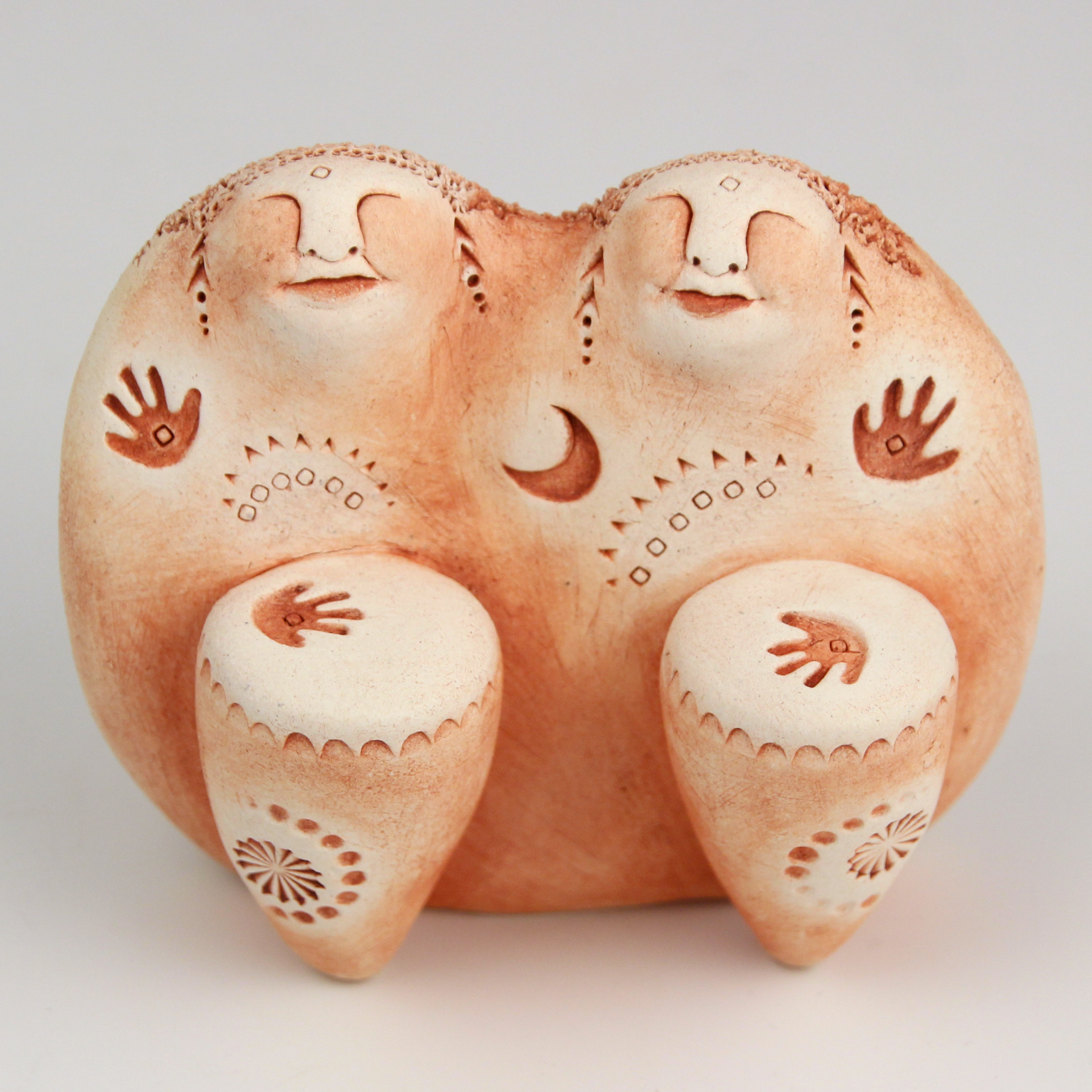 2 women drumming in their joy and spirits!  Debbie Berrow’s sculptures are delightful, depthful and offer beautifully detailed images.  Handprints and spirals on their drums.  Drumming for the moon. Handmade of stoneware. There may be variations in each piece due to the handmade nature of this item.