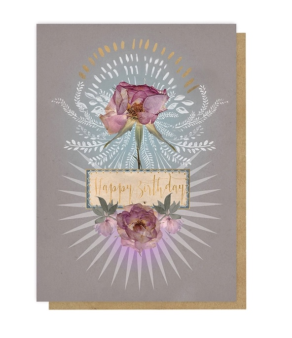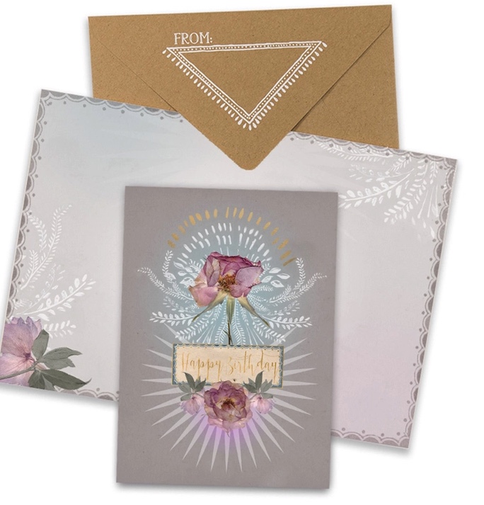 Happy Birthday greeting card.  Made of premium quality recycled paper. Front of card is embellished with gold foil details.  Comes with a kraft paper envelope. To printed on the front and From on the back flap.