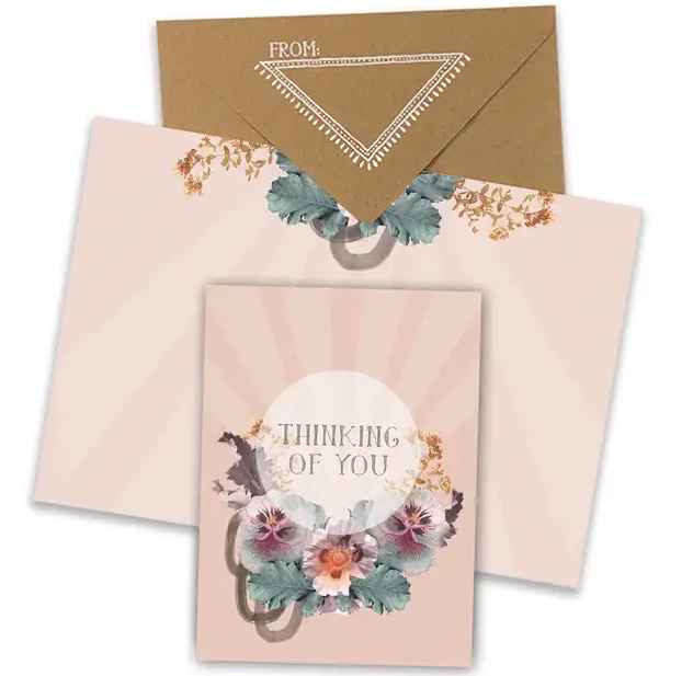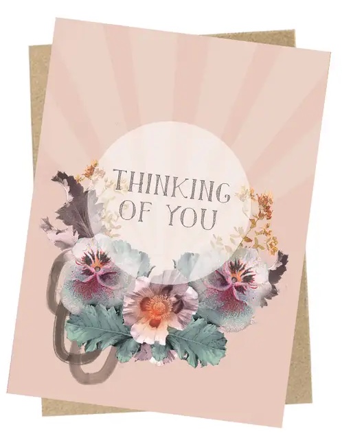 Thinking of You greeting card. Â Small card. Made of premium quality recycled paper. Front of card is embellished with glitter. Â Comes with a kraft paper envelope.
